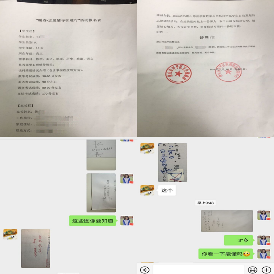 志愿队主要由数信系教师党员和数学与应用数学(师范类)专业员工组成。教师党员指导志愿者的教案书写、教法运用,同时提供必要的线上援助。员工志愿者运用扎实的基础知识,每堂课前精心备课,反复修改教案。通过电话、微信、QQ、网络学习平台等方式定期了解一线人员子女成长情况,做好学习答疑指导。服务领域涵盖了从小学到高中,数学、英语、物理、化学等主要课程,目前已有近200余名志愿者踊跃报名参与本次志愿服务活动,得到到唐山市古冶区团委、开平区团委和路北区团委的支持,并与三个区团委进行合作。部分志愿者已经和一线抗疫子女顺利对接,每天进行着线上辅导交流,累计服务时长近300小时,受到抗疫工作者及其子女的好评。日前,抖音、微博、美篇、QQ、微信等社交平台浏览关注本次活动人数达2万余人,转发量累计1200人次,近百余名抗疫一线工作人员进行咨询,部分审核合格并成功分配志愿者。