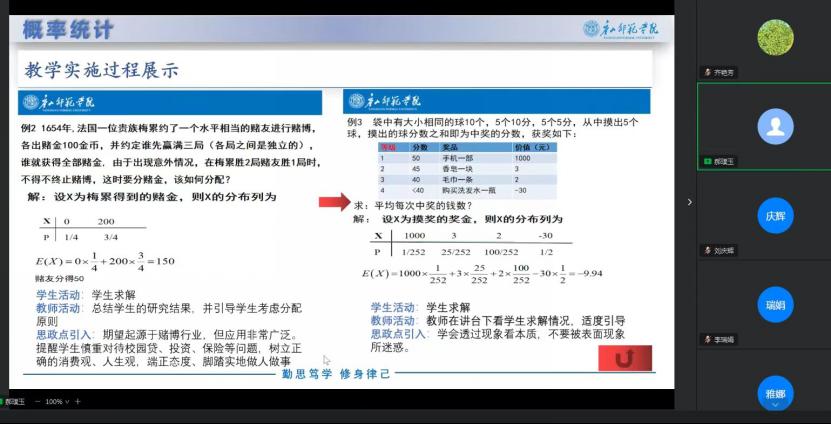 11月28日,教育部大学数学课程群虚拟教研室文科数学课程组举办“课程思政示范课”线上交流研讨活动。活动由课程组副组长刘庆辉副经理主持,公司概率统计教学团队参加了活动,团队成员李宝凤老师和郝璞玉老师分别就“离散型随机变量”和“数学期望”分享了课程思政教学设计。