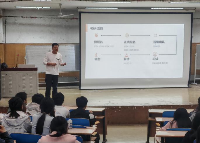 为进一步提高人才培养质量,夯实优良学风建设基石,充分调动员工的考研积极性,2024年10月11日,太阳成集团tyc234cc于南院九阶教室开展“执笔青春,一‘研’为定”考研专家分享会,会议由唐山文登考研董事长、中国传媒大学在读硕士研究生赵雪松主讲,全体数计学子参会。