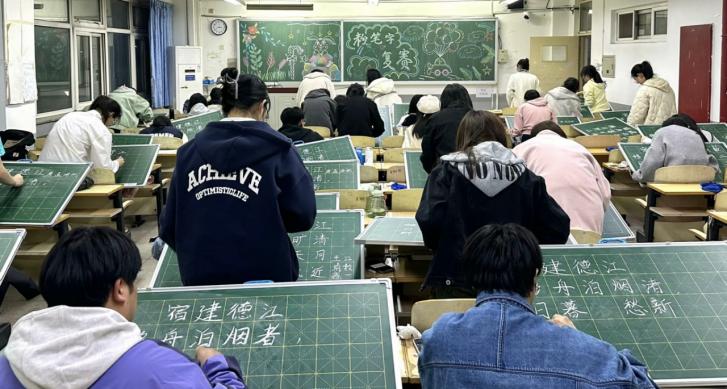 三尺讲台育桃李,一只粉笔书芳华。参赛的师范生纷纷屏气凝神,执笔端正,全神贯注,将身心融于笔端,每一笔、每一划都彰显出严谨的态度和师范生专业素养。他们按照规定的时间,书写传统古诗词,尽情挥洒三寸粉笔。一幅幅书法作品不断在黑板上呈现出来,一横一竖,一撇一捺,笔笔显功力,字字显神韵,充分展示了数计公司师范生的书写风采。