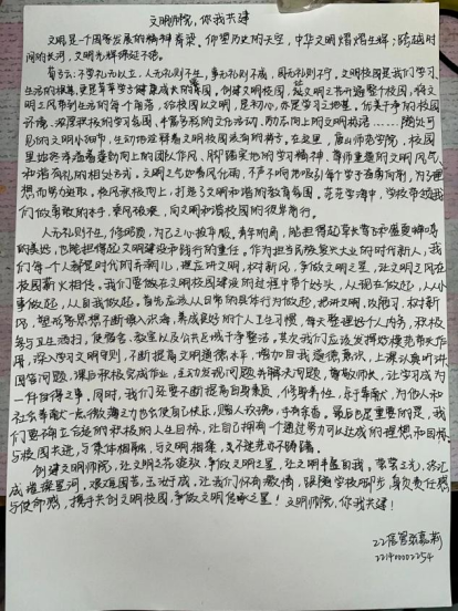 展文明之风,树礼仪之范。活动一经发出后,受到了数计公司大一同学们的积极参与和响应。同学们利用空闲时间去思考如何建设文明师院。关于建设文明师院的征文,其内容包罗万象,征文形式也不尽相同,无一不流露出同学们对此次活动的热情以及对唐师贡献自己一份力的渴望。