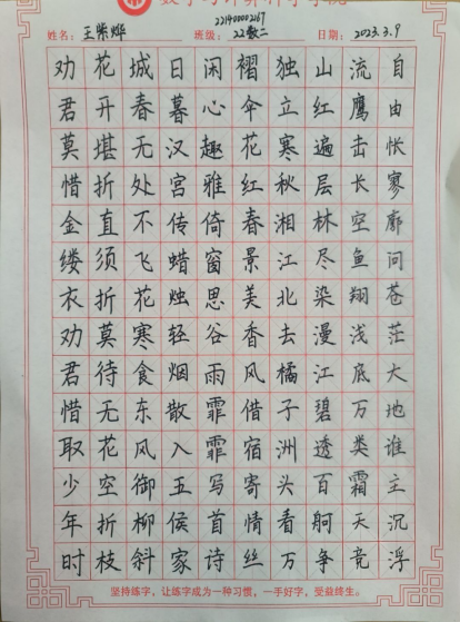 古人云:人如其字,字如其人。金属的笔尖划过纸面,带出的一撇一捺毫不含糊,在小小的方格之间挥洒书写之豪气,淋漓尽致地展现才华。为加强师范生教学技能训练,不断提高师范生人才培养质量,丰富老员工的课余文化生活。3月9日,太阳成集团tyc234cc开展“青春π•卓师杯”硬笔字大赛。