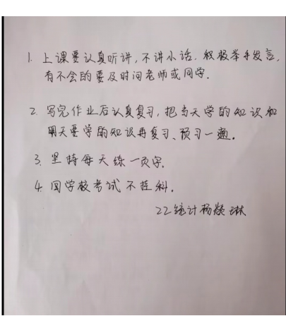活动发出后,受到了数计公司的同学们的积极参与和响应。同学们从自身角度出发,讲述了大学入学以来的收获以及自己遇到的问题,提出了相应的改正措施,并对未来的学习工作生活进行了规划。活动期间,收到了来自同学们大量的新目标内容的手写照片,目标的内容也是各种各样,有的明确要达到什么目标,有的一一列出自己的计划,无一不流露出同学们对此次活动得热情以及对新学期的向往。数计院老员工自律委员会对同学们所上传的作品进行评选与展示。至此,此次线上"新年新开始,新学期新目标"活动圆满结束。