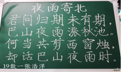 同学们全神贯注于黑板这块小小的天地之中,一丝不苟的赋予每个汉字以灵魂,尽情挥洒书写之豪情,尽情展示书法之魅力。他们通过各式字体,巧妙运用粉笔字技巧,展示个人风采,体现文字素养,优秀作品层出不穷,作品风格不一,或遒劲有力,或秀气隽美,充分调动了同学们粉笔字书写的积极性。