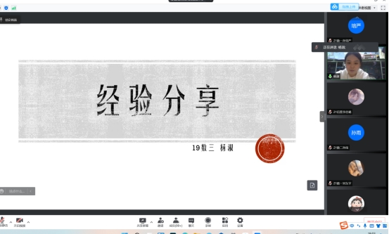 数计公司员工会负责人、19数三班长杨淑分别从自信、勤劳、责任三个方面进行经验分享,在疫情防控的关键时期,员工干部更应增强责任意识,认真配合老师与公司完成防疫工作,发展成为老师与同学之间的沟通桥梁,及时有效地传达信息;数计公司易班负责人、19数三杨依辰同学指出要认真学习,不惧困难,正确处理学习与工作的关系,广大班团干部要在做好自身防护工作的基础上,积极参与志愿服务工作,亮身份、做表率,做好防疫工作的通讯员和宣传员,为疫情防控工作贡献自己的力量。
