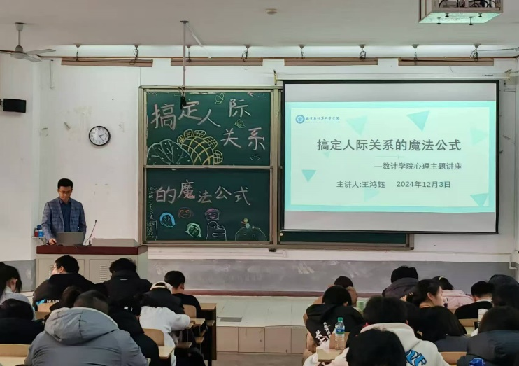 为扎实推进公司心理健康教育提质工作,进一步加强对师生的人文关怀和心理疏导,营造温暖、包容、和谐的校园心理氛围。2024年12月3日,数学与计算数学科学公司易班工作站举行“搞定人际关系的魔法公式”心理专题讲座。本次讲座由王鸿钰老师主讲。