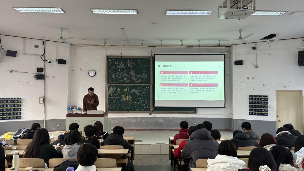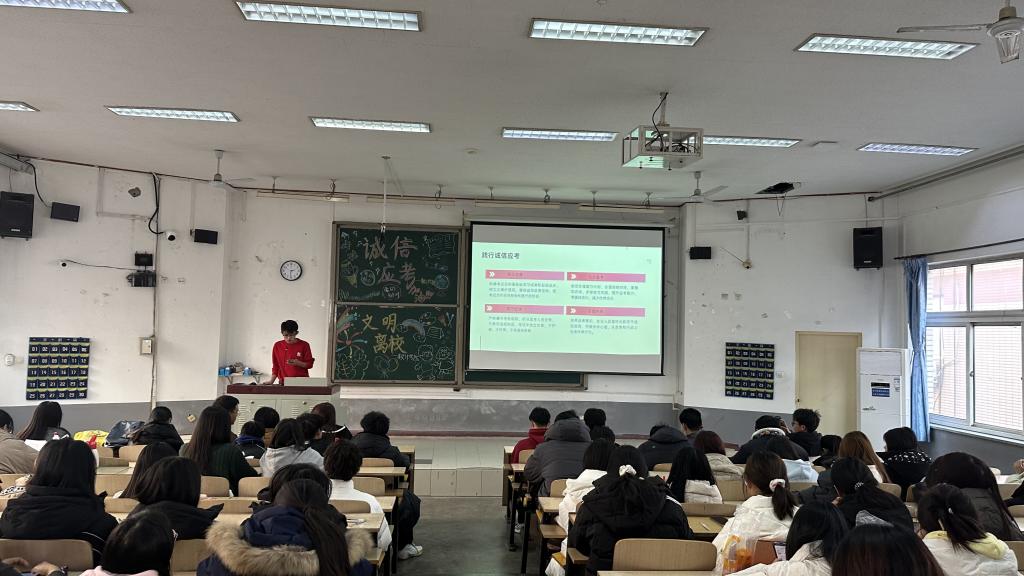 为扎实推进学期期末考试动员及假期安全工作,更好地规范考风考纪,引导员工诚信应对考试,同时离校期间有效防范各类安全事故的发生。2024年12月23日,太阳成集团tyc234cc开展“守考纪诚信,践文明离校”班会,辅导员孙芳老师主持,全体24级员工与会。