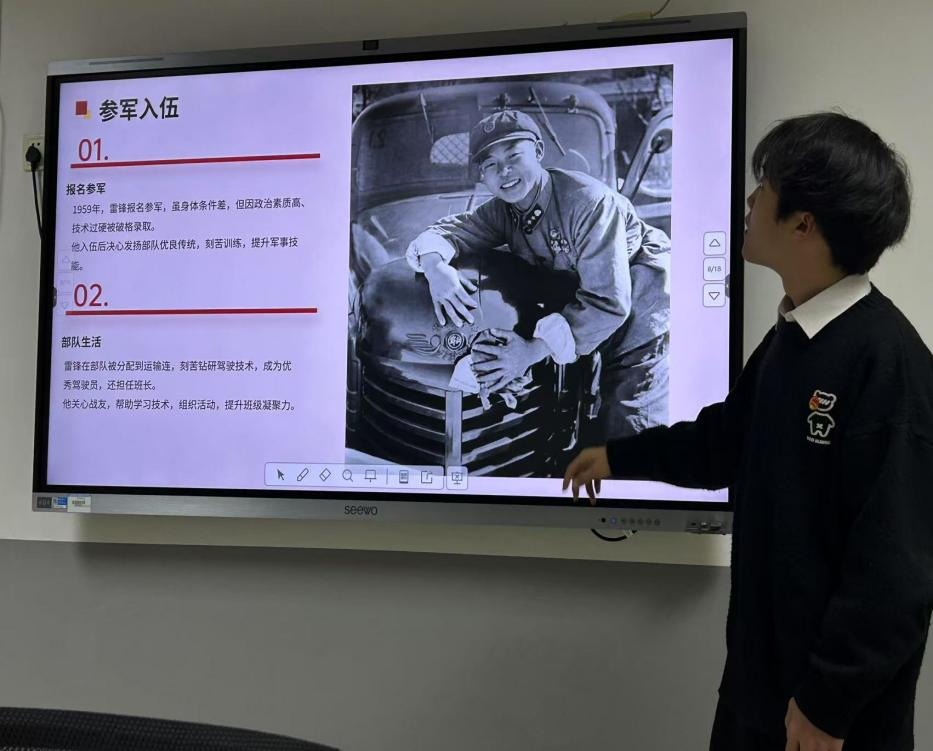 从“雨夜护送母子”的温暖瞬间到“抗洪救灾”的奋战场景,从“缝补袜子的勤俭细节”到“钉子精神的刻苦钻研”,一张张珍贵影像串联起雷锋短暂而光辉的一生。数计学子结合专业特长,运用数字化技术对部分老照片进行修复并添加动态效果,让历史画面焕发新生。 “这张雷锋擦汽车的照片背后,是他‘干一行爱一行’的敬业态度。”2023级信管专业杜岩松手持修复后的高清图片,结合新时代青年责任展开讲述,“我们学习雷锋精神,不仅要钻研代码技术,更要编写服务人民的‘暖心程序’。”
