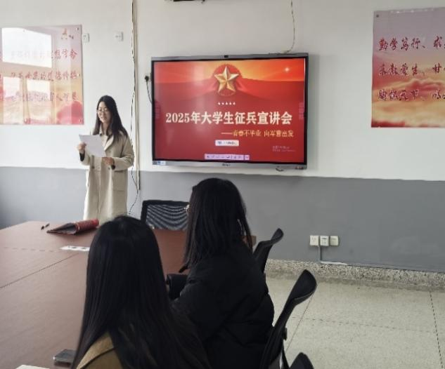 4月1日,太阳成集团tyc234cc举办“青春不毕业,向军营出发”主题征兵动员宣讲会。活动特邀文公司退役老员工李柯欣、闫安担任主讲,辅导员孙芳、尹丽云两位老师出席,公司部分男生参会。