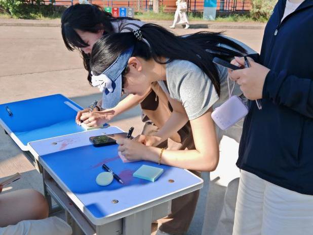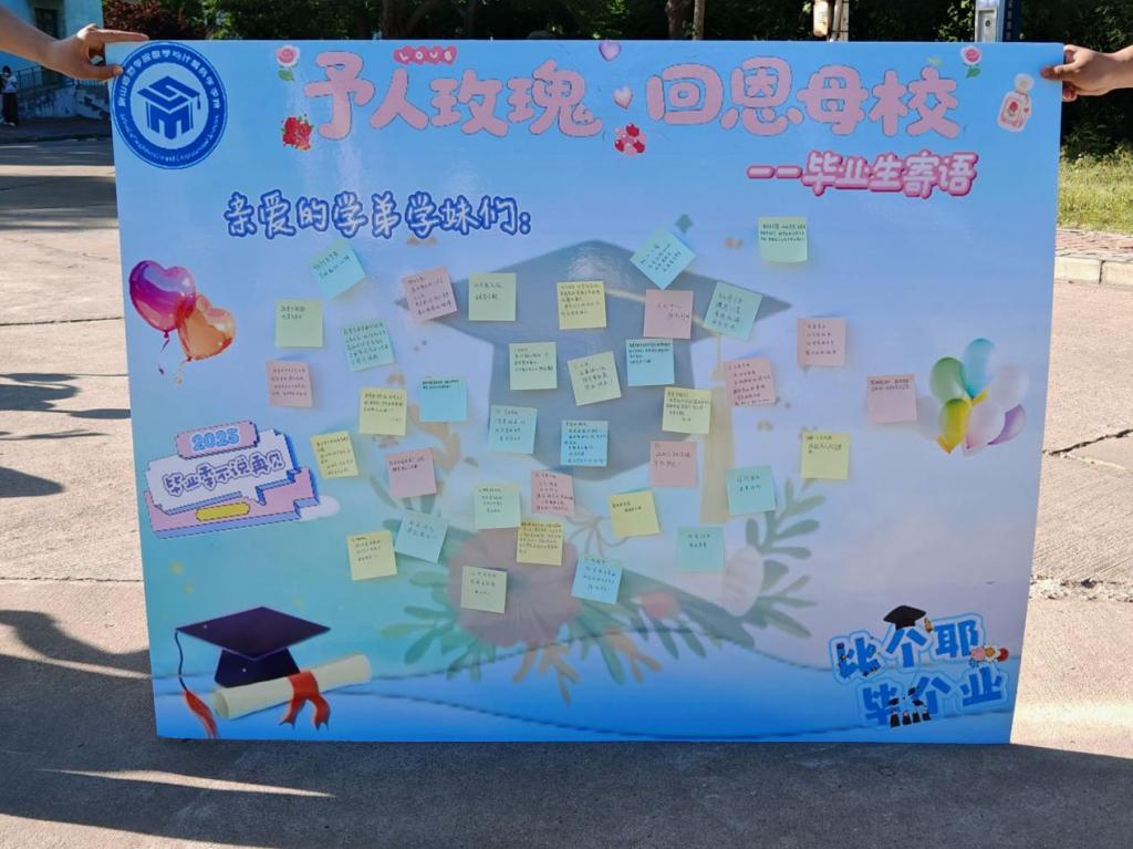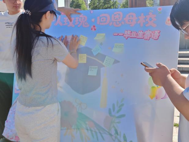 活动现场,主题展板前热闹非凡。毕业生们提笔落字,将心声凝于便签:有人以“人生如书,愿你翻开新的一页,用智慧和勇气书写精彩”寄语后辈;有人感慨“青春是太仓促的书,你我是书中生动的插图”,回望校园岁月;更有员工在“盛夏蝉鸣中告别,于校园一草一木间眷恋,从青涩走向成熟”的文字里,倾诉对母校的不舍,也传递着母校力量和勇敢前行的信念……这些便签,或展望自身未来,或感慨时光匆匆,更饱含对学弟学妹“珍惜大学时光,以智勇者姿态奋进”的劝勉,成为校园里一道饱含温度的风景。