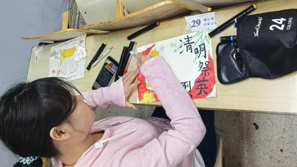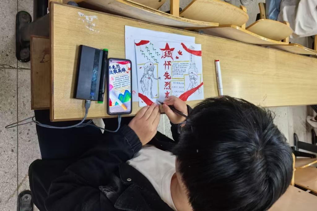 清明寄哀思,薪火传英烈。同学们结合对革命历史的理解与对先烈的敬仰,以手绘创作的形式还原经典场景、刻画英雄形象、传递家国情怀,或是庄严的革命烈士纪念碑,或是英勇奋战的先烈形象,或是清明踏青、祭扫的传统画面,每一笔都饱含敬意,线条沉稳有力、形象鲜活生动。通过色彩搭配烘托缅怀先烈、致敬英雄的庄重氛围,同时以工整清秀的字迹誊写红色故事、英烈语录与清明寄语,让文字与画面相辅相成,传递真挚情感。