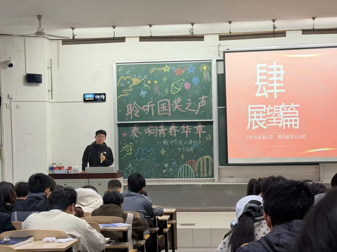 活动现场,2022级信计班姚甲申作为国家奖学金获得者上台分享。他结合自身学习经历,围绕专业学习、时间管理、科研竞赛、综合素质提升等方面,毫无保留地分享了成长心得与宝贵经验。分享中,姚甲申借助精心制作的PPT,生动讲述了自己从迷茫到坚定、从平凡到优秀的蜕变历程,细致拆解了攻克专业难点、平衡学业与实践的实用方法,处处彰显着对知识的敬畏与对成长的追求,生动诠释了国奖精神作为青春成长“领航标”的深刻内涵。