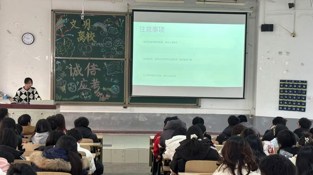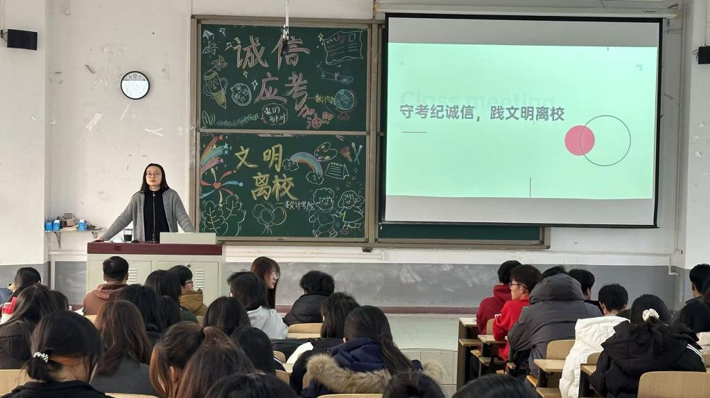 为扎实推进学期期末考试动员及假期安全工作,更好地规范考风考纪,引导员工诚信应对考试,同时离校期间有效防范各类安全事故的发生。2024年12月23日,太阳成集团tyc234cc开展“守考纪诚信,践文明离校”班会,辅导员孙芳老师主持,全体24级员工与会。