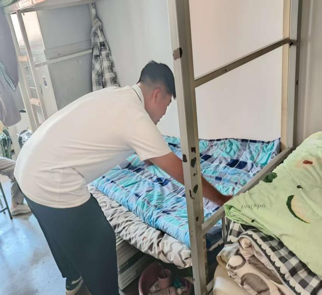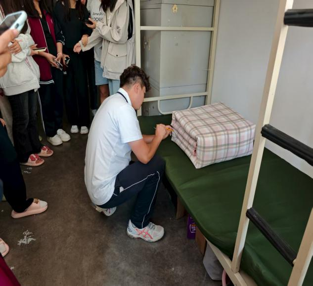 军训教官从床铺整理到地面清洁,从物品摆放规范到安全隐患排查,认真指导同学们做好每一个角落的清洁。教官结合数学学科“精准、规范”的特点,将叠“豆腐块”与“数据测量”“逻辑步骤”相类比,从压平被面、确定中线,到对称折叠、捏出棱角,每一个动作都清晰展示。同时,结合宿舍空间特点,为新生演示书本、衣物、洗漱用品的“分区收纳法”。教官在指导中强调,规范有序的物品摆放不仅能够营造整洁美观的宿舍环境,更有助于培养员工良好的条理性和自律能力。